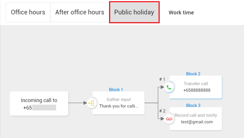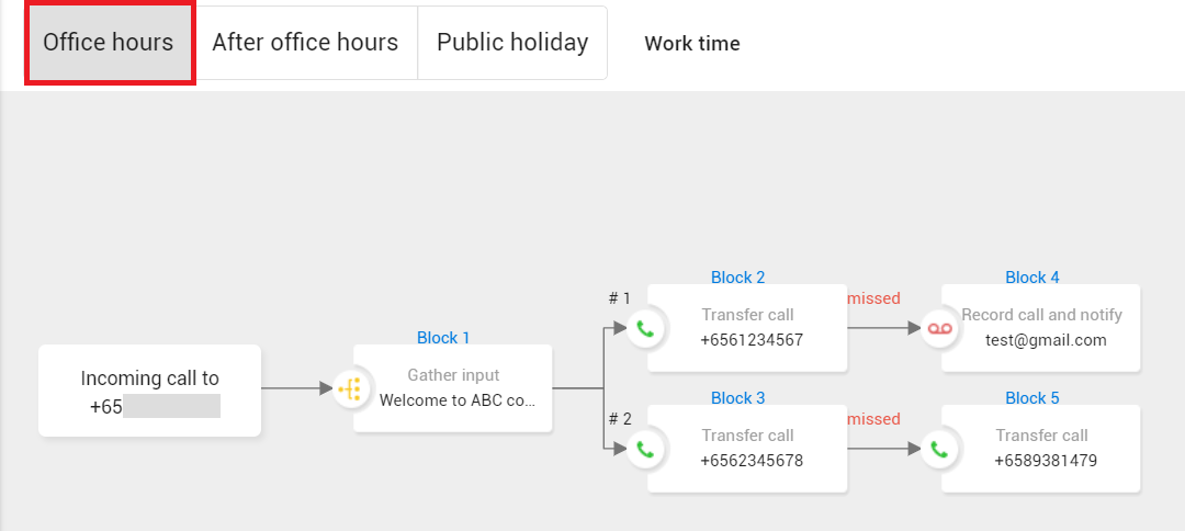 - If Press 2, transfer to Number 2 => Miss call => Transfer to Number 2